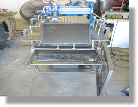 Its a little tough to see in this shot but the steel top has been attached and the holes were drilled in the top to allow the vacuum system connection to come up through the table top and for the wires leading down to the computer and cnc controller. We contemplated welding the top or using a bolt system to secure it so that it could be removed later. In the end we decided to weld the top to the cart and make it a one piece cart to cut down on labor time.