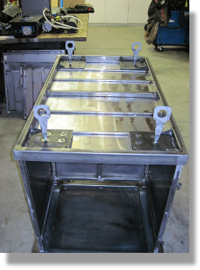 Here is a view of the cart getting ready to head off to powder coating. Ready to be picked up via a fork lift using chains to the connection points.