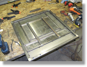 This is a view of the back side of the front door or main door for the control center. This was a late addition to the design. We formed some small pans out of stainless steel and then created a framework to hold them to the back of the front door. The stainless steel will hold led lights which will shine through the cutout in the front. Or when its off the stainless steel will provide a nice contrast.