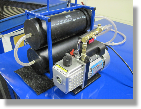 Here is a picture of the finished Vacuum pump setup. The custom cage for holding the vacuum tubes was powder coated to match the cart. This unit will mount in the back half of the control center cart.
